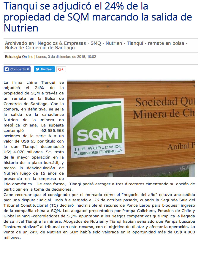 China Tianqi entra en SQM tras la mayor operación en la historia de la bolsa - (Medios Regionales Cadena El Mercurio)