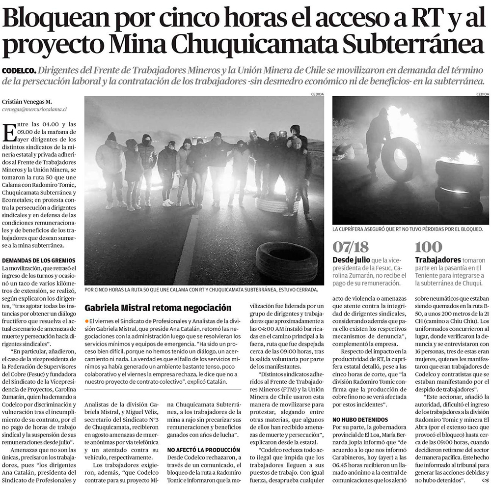 Dirigentes bloquearon por 5 horas acceso a Radomiro Tomic - (El Mercurio de Antofagasta)