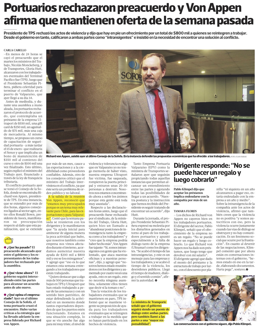 Tras rechazo a oferta, Gobierno acusa intransigencia de las partes - (El Mercurio de Valparaíso)