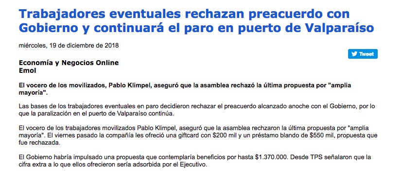 Estibadores de Valparaíso rechazan acuerdo logrado con Gobierno y buscan paro nacional - (El Mercurio de Santiago)