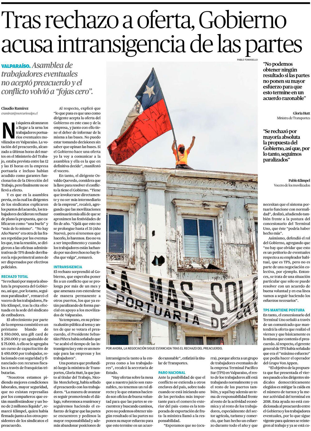 Estibadores de Valparaíso rechazan acuerdo logrado con Gobierno y buscan paro nacional - (El Mercurio de Santiago)