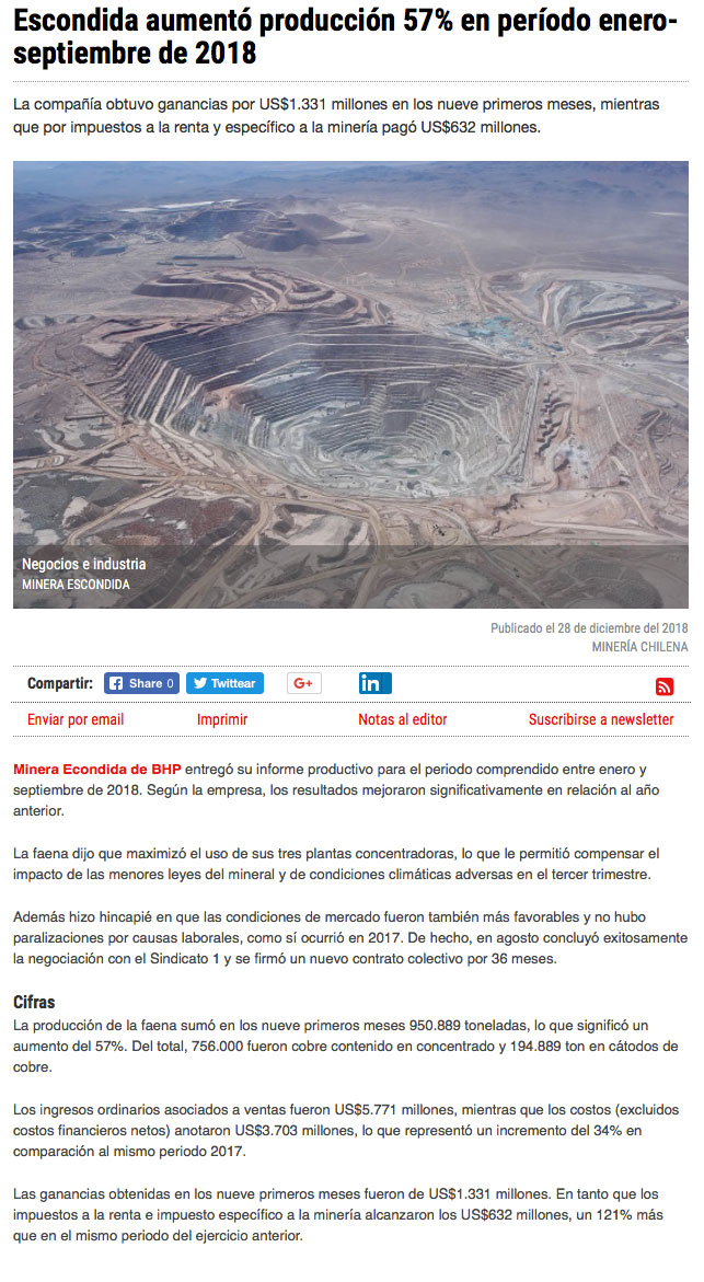 Ganancias de Escondida suben 135%: sumaron US$1.330 millones - (El Mercurio de Santiago)