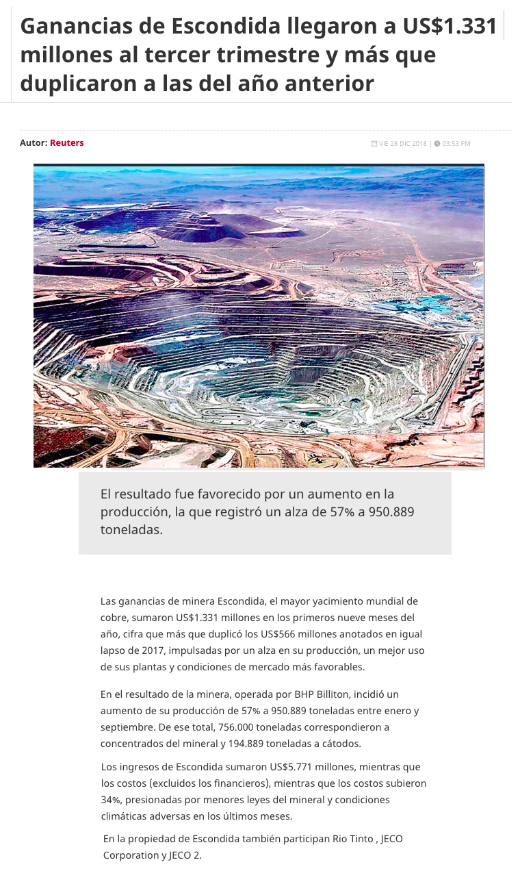 Ganancias de Escondida suben 135%: sumaron US$1.330 millones - (El Mercurio de Santiago)