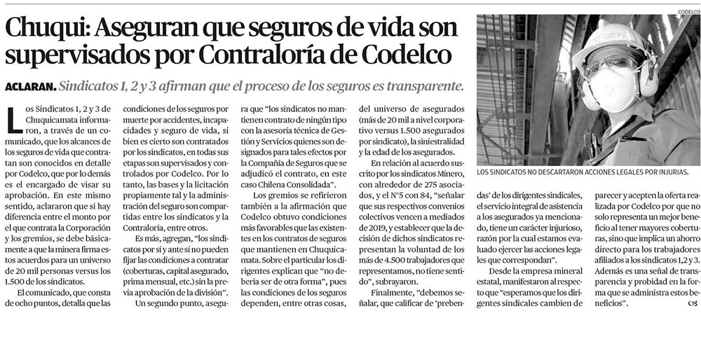 Cochilco entra a pugna entre Codelco y sindicatos de Chuqui por controversia en seguros de vida - (La Tercera)