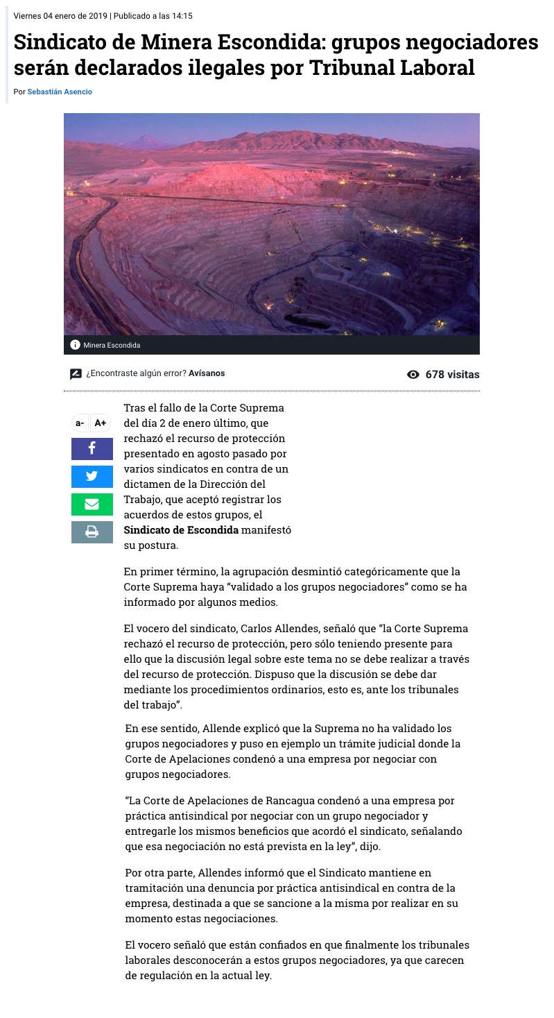 Sindicato de Escondida descarta que fallo de Corte Suprema valide existencia de grupos negociadores - (economiaynegocios online)