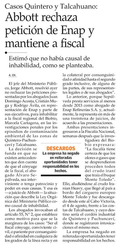 Jorge Abbott rechaza petición de Enap y mantiene a Cartagena - (El Mercurio de Valparaíso)