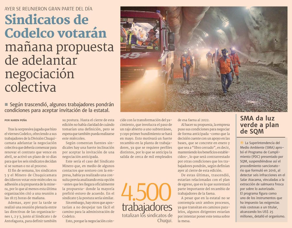 Chuquicamata: oferta de Codelco en negociación anticipada rondaría los $9 mills. - (El Mercurio de Santiago)
