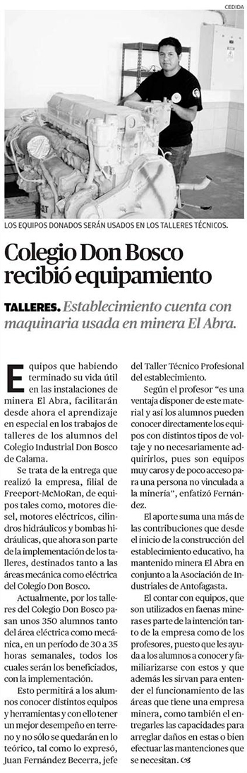 El Abra potencia talleres del Colegio Don Bosco de Calama - (El Mercurio de Antofagasta)