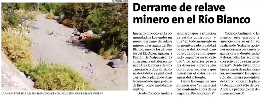 Emergencia genera derrame de relave en aguas del río Blanco - (El Mercurio de Valparaíso)