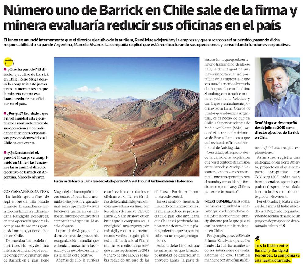 Barrick elimina cargo de director ejecutivo y sella la salida de René Muga - (El Mercurio de Santiago)