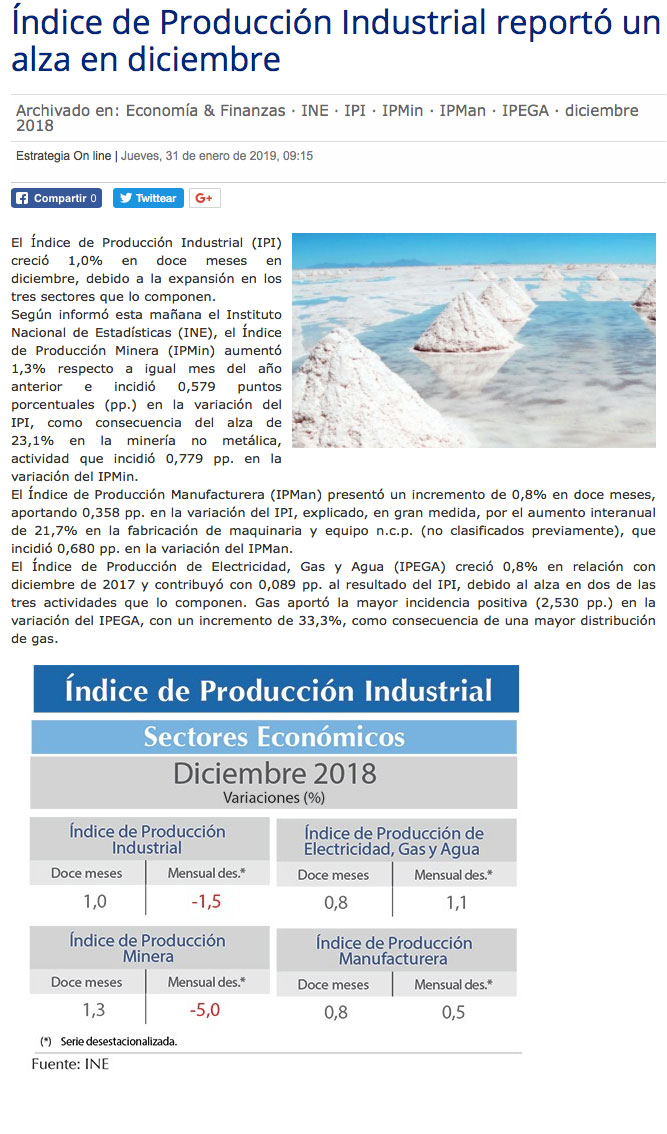 Datos de la industria ratifican avance del PIB de 4% en 2018 - (Diario Financiero)
