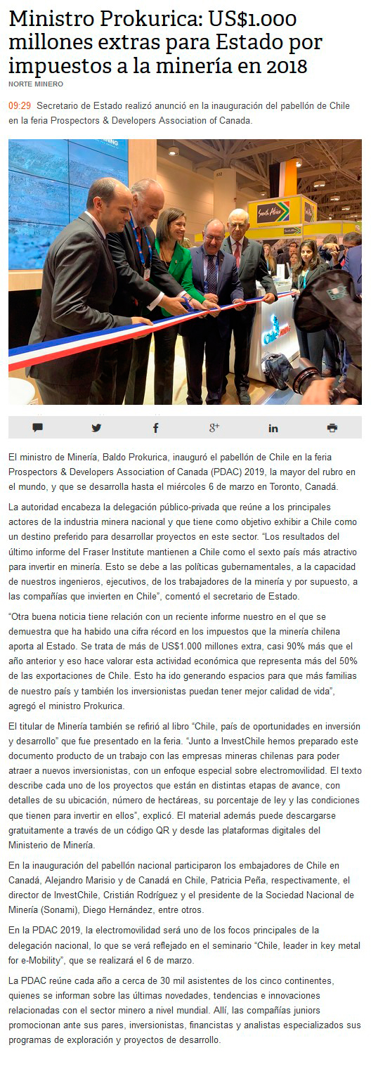 Ministro Prokurica inaugura pabellón de Chile en feria internacional minera PDAC 2019, en Canadá - (Estrategia)