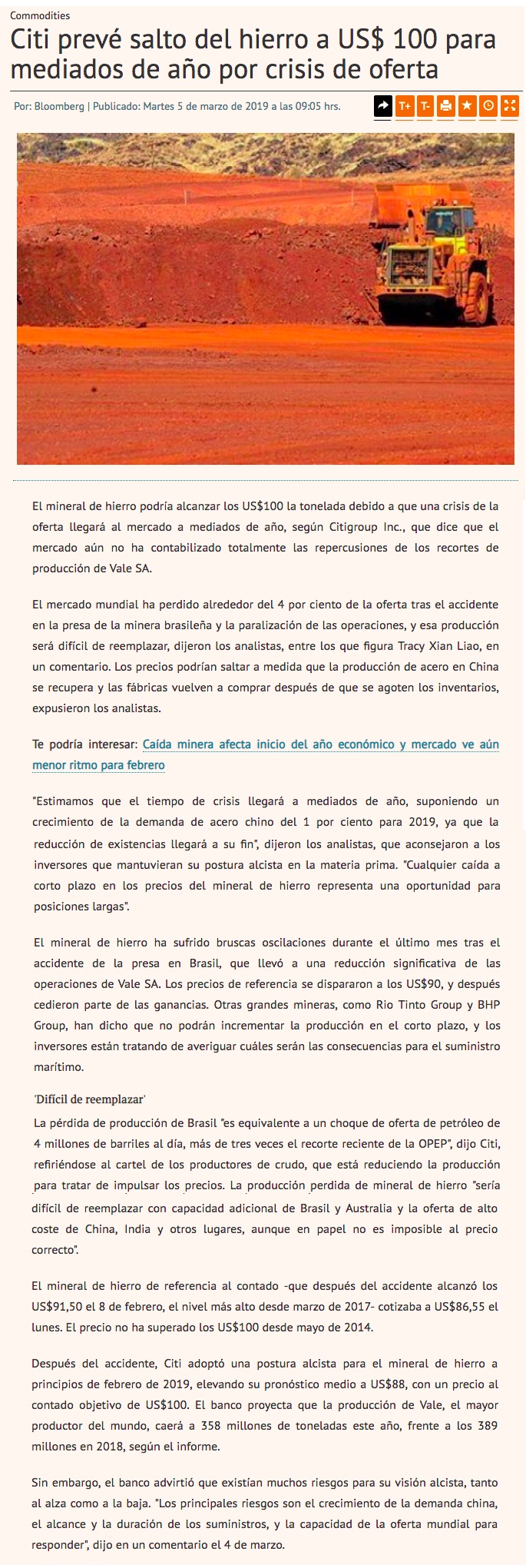 Citi cree que el hierro alcanzará la barrera de los US$ 100 a mediados de año - (Pulso Online)