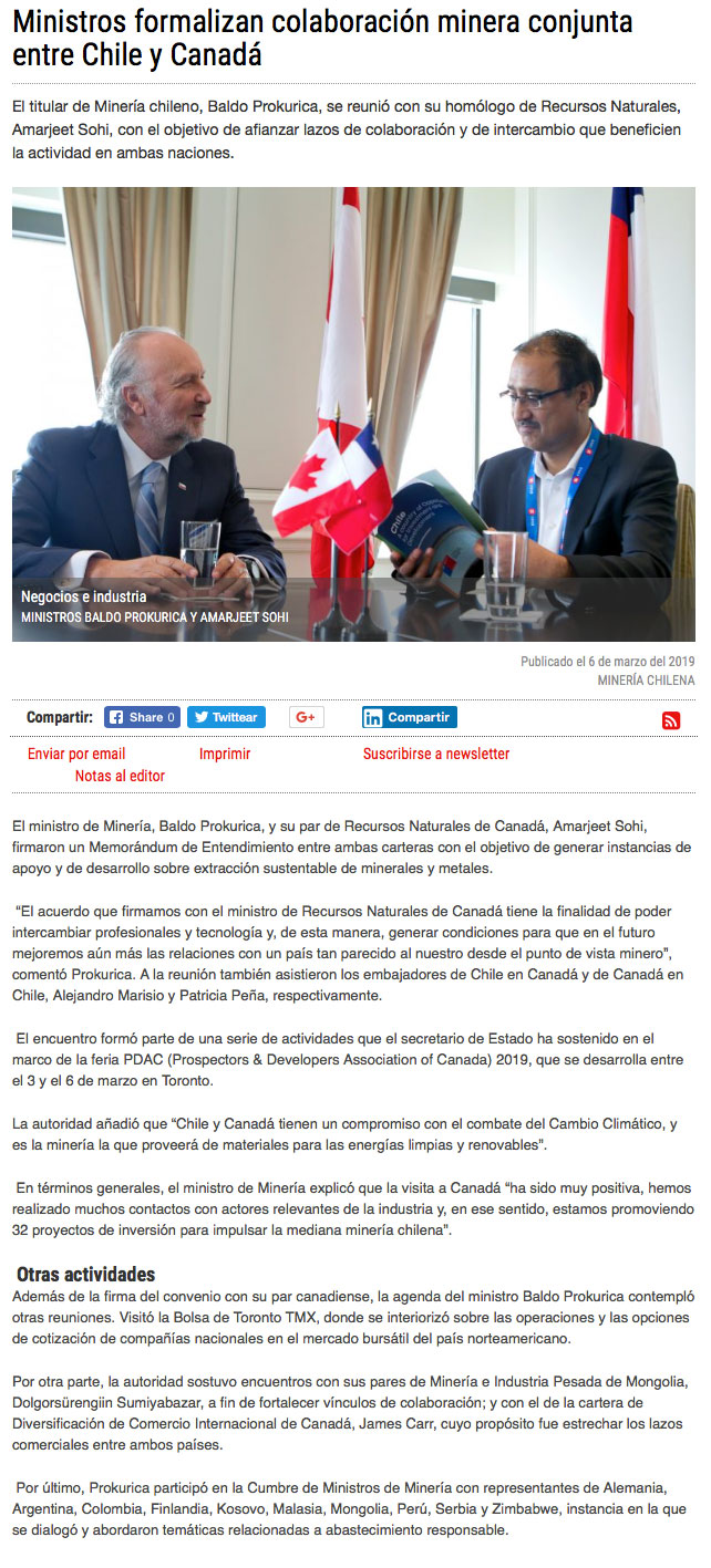 Chile y Canadá acuerdan colaborar en la extracción sustentable de minerales y metales - (americaeconomia online)