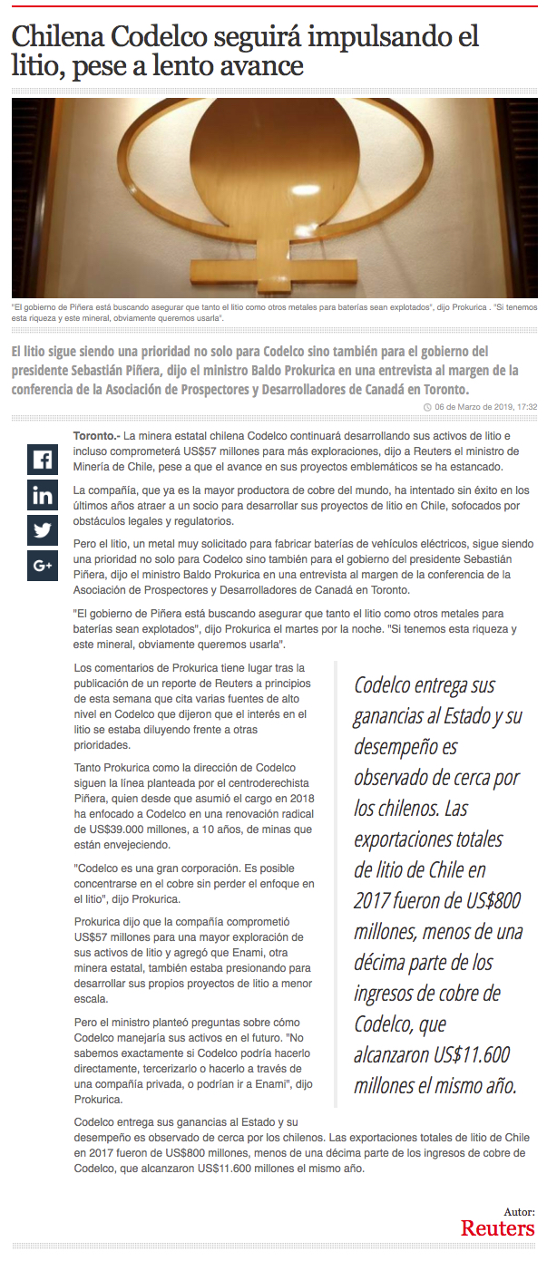 Ministro Prokurica asegura que Codelco seguirá impulsando el litio y hará más exploraciones - (Pulso Online)