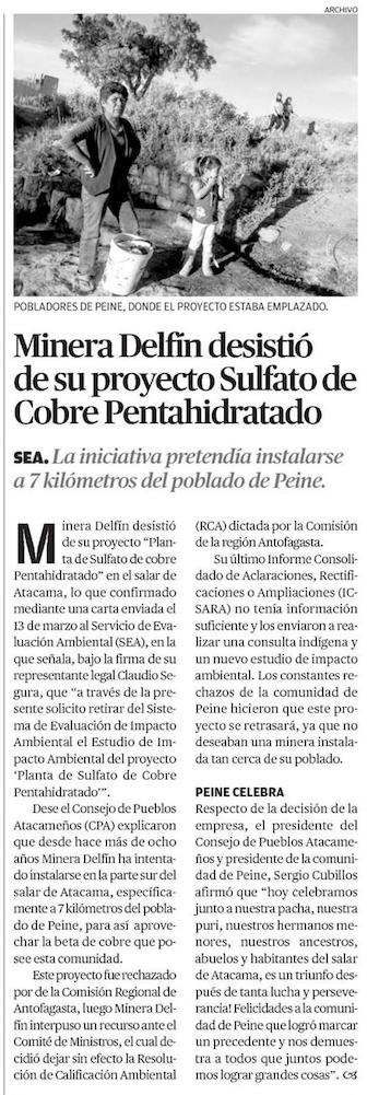 Minera Delfín desistió de su proyecto Sulfato de Cobre Pentahidratado - (El Mercurio de Antofagasta)