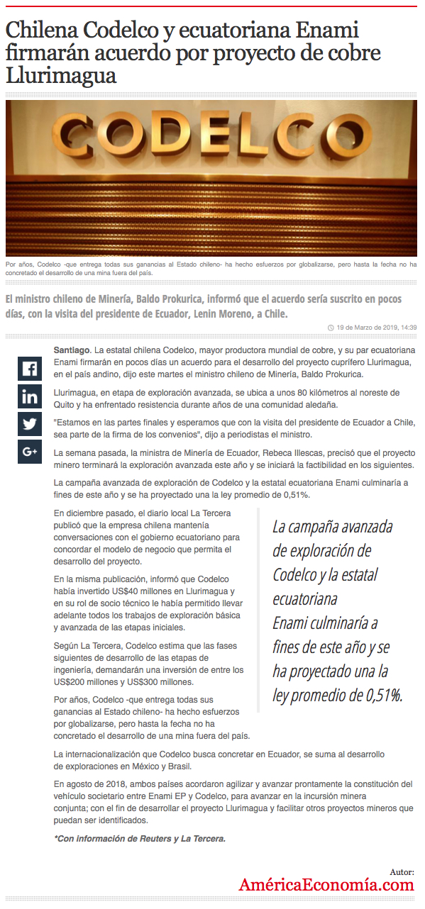 Codelco se acerca a un acuerdo para impulsar proyecto en Ecuador - (El Mercurio de Santiago)