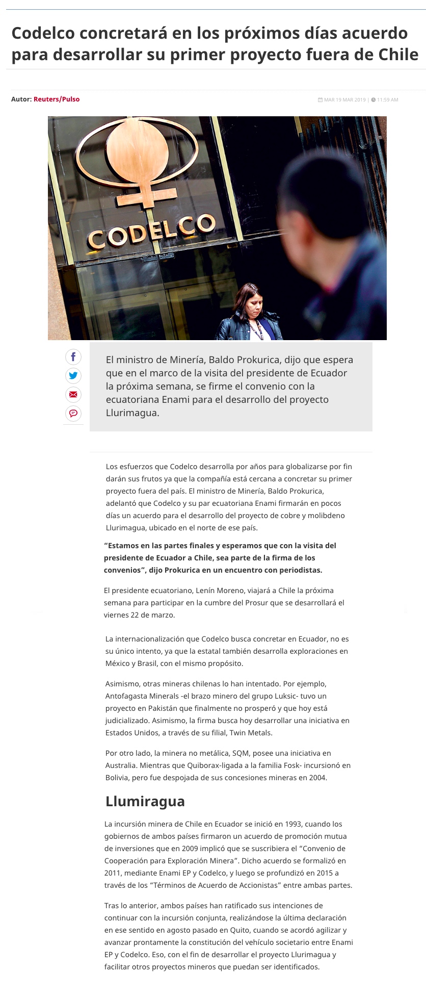 Codelco se acerca a un acuerdo para impulsar proyecto en Ecuador - (El Mercurio de Santiago)
