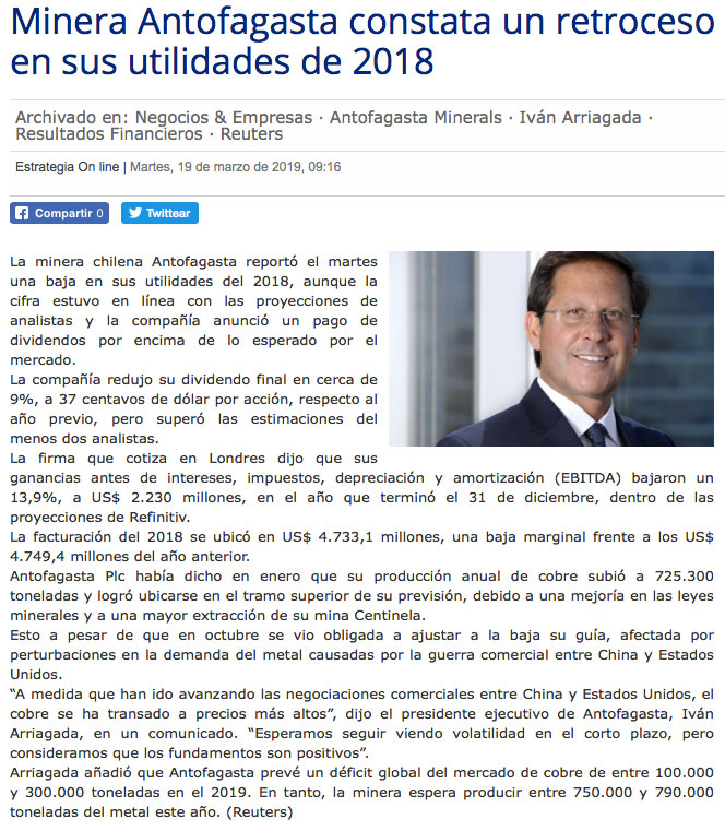 Chilena Antofagasta reporta baja de ganancias en 2018 tras facturar US$4.733M - (americaeconomia online)