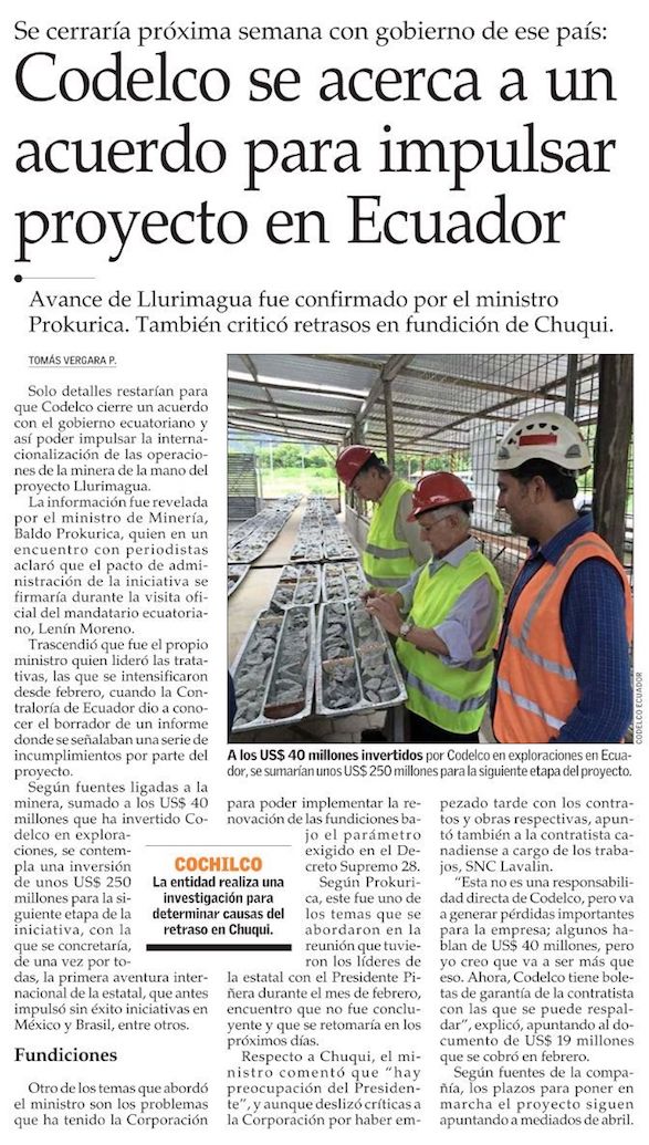 Chilena Codelco y ecuatoriana Enami firmarán acuerdo por proyecto de cobre Llurimagua - (americaeconomia online)