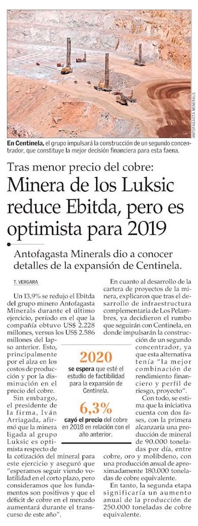 Antofagasta Plc entrega resultados 2018 y adelanta mejor precio del cobre este año - (El Mercurio de Antofagasta)