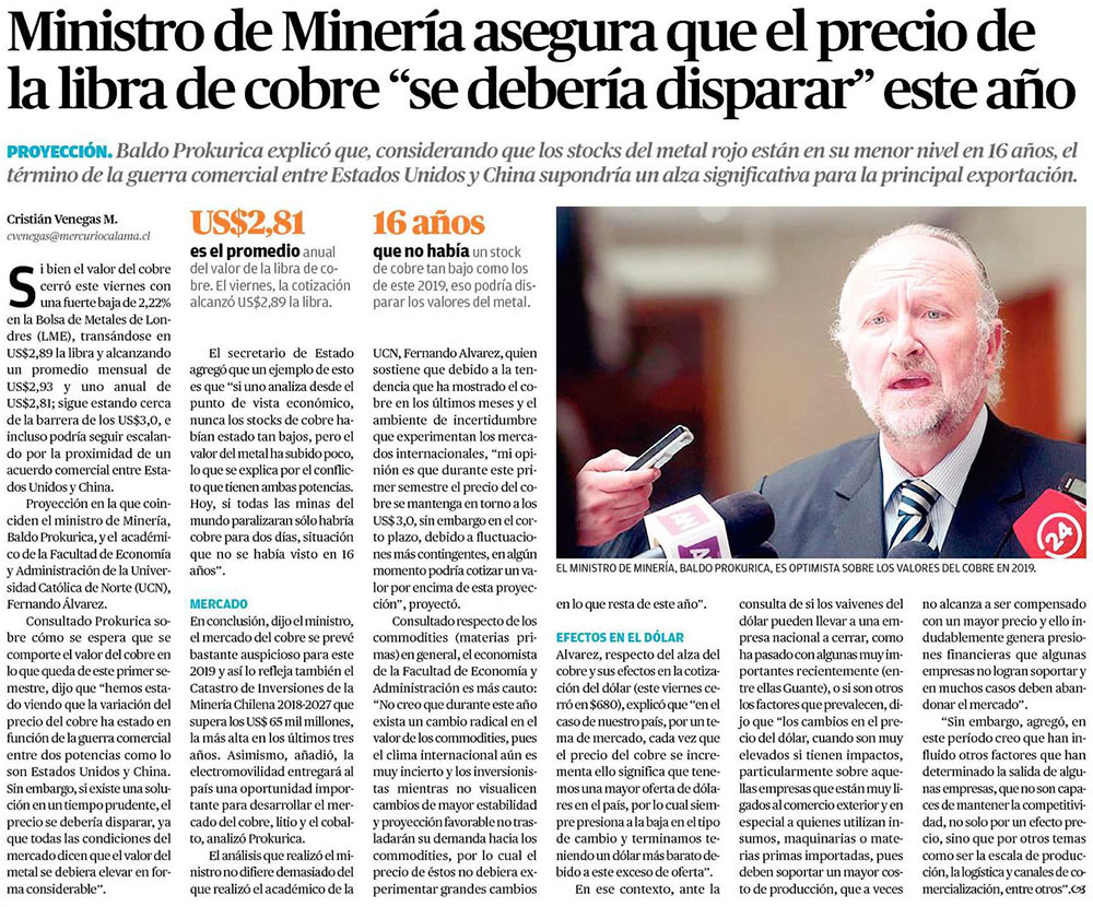Ministro de Minería asegura que el precio de la libra de cobre “se debería disparar” este año - (El Mercurio de Calama)