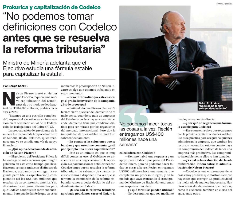Ministro Prokurica se pliega a las preocupaciones de Nelson Pizarro por endeudamiento de Codelco - (Pulso Online)