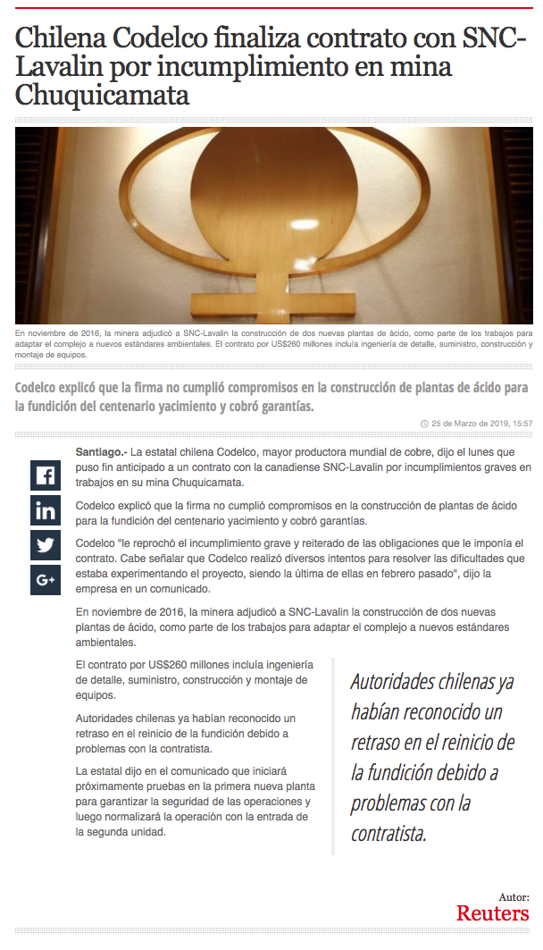 Codelco acusa incumplimiento y rompe contratos con SNC Lavalin - (El Mercurio de Santiago)