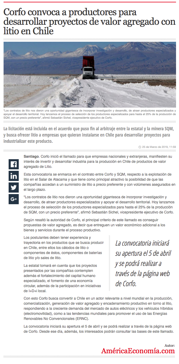 Corfo lanza llamado para desarrollo industria valor agregado de litio con 25% producción de SQM - (economiaynegocios online)
