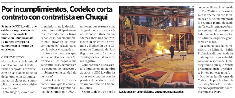Codelco acusa incumplimiento y rompe contratos con SNC Lavalin - (El Mercurio de Santiago)