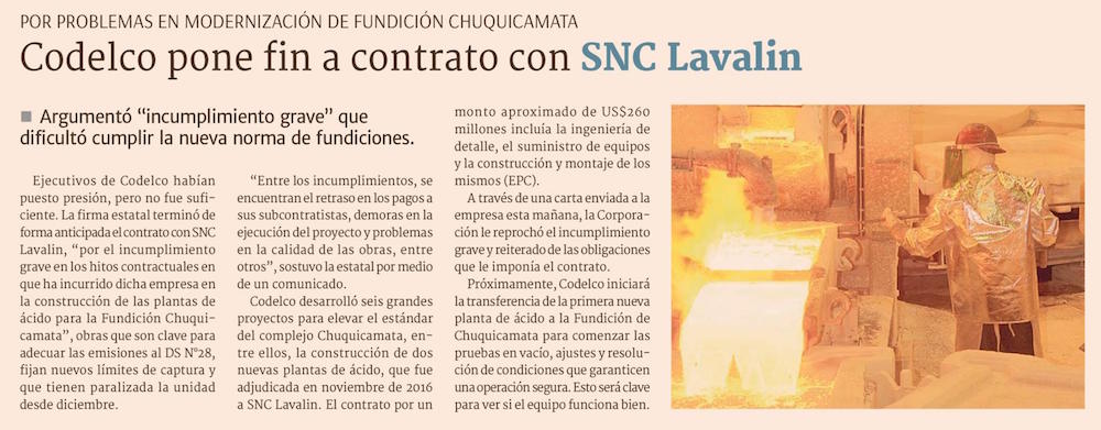 Codelco acusa incumplimiento y rompe contratos con SNC Lavalin - (El Mercurio de Santiago)