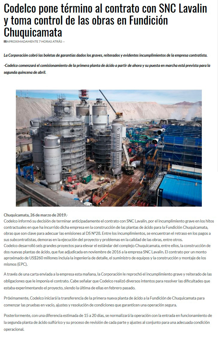 Codelco decide terminar vínculo con SNC Lavalin por incumplimiento en obras Fundición Chuquicamata - (economiaynegocios online)