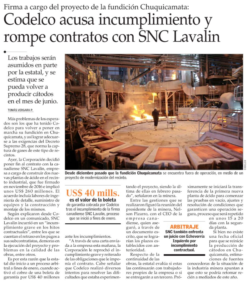 Codelco decide terminar vínculo con SNC Lavalin por incumplimiento en obras Fundición Chuquicamata - (economiaynegocios online)