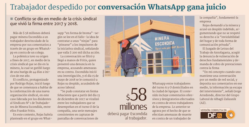 Conflicto sindical en Escondida: Justicia ordena pagar indemnización de $ 58 millones a trabajador despedido por conversación en Whatsapp - (DF Online)