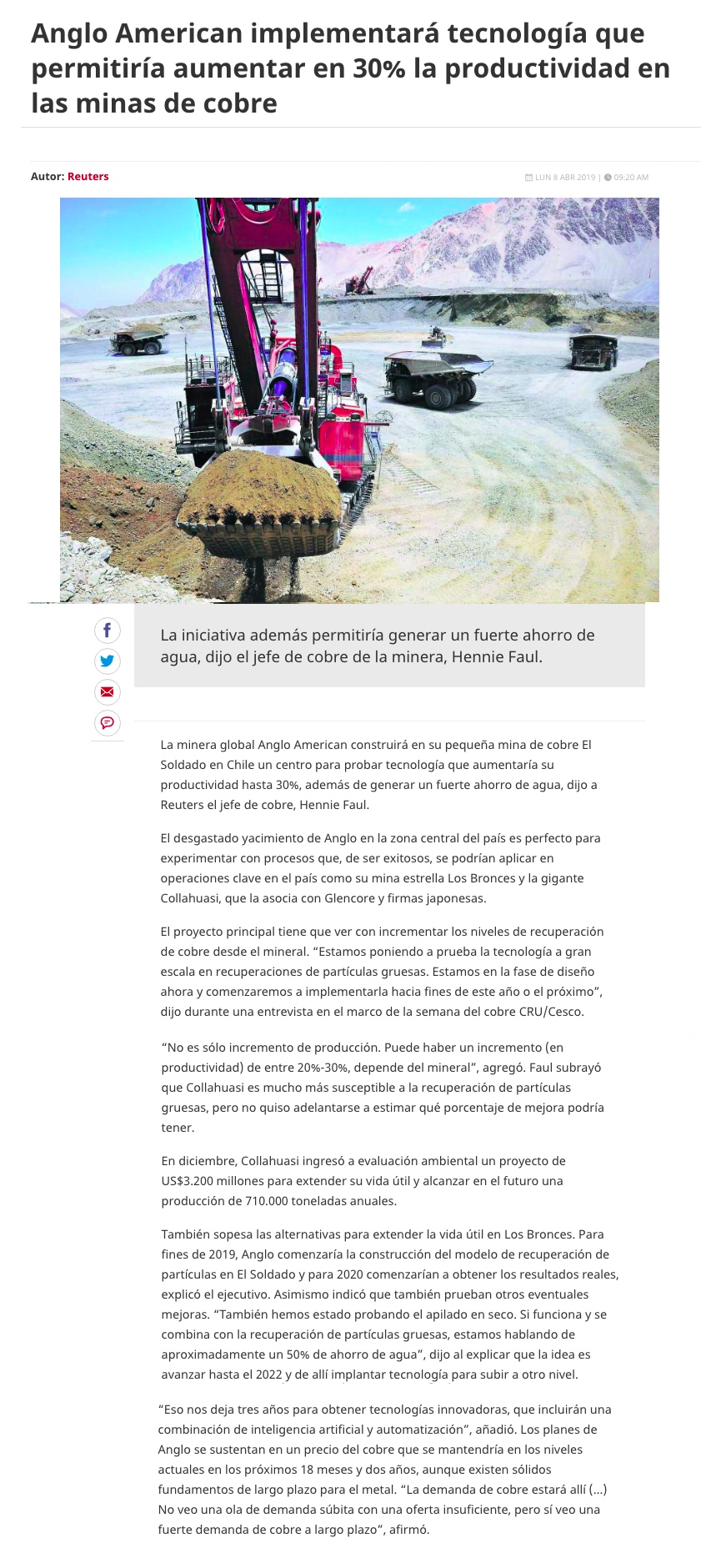 Anglo American apunta a mejorar su productividad hasta en 30% con apoyo de tecnología - (americaeconomia online)