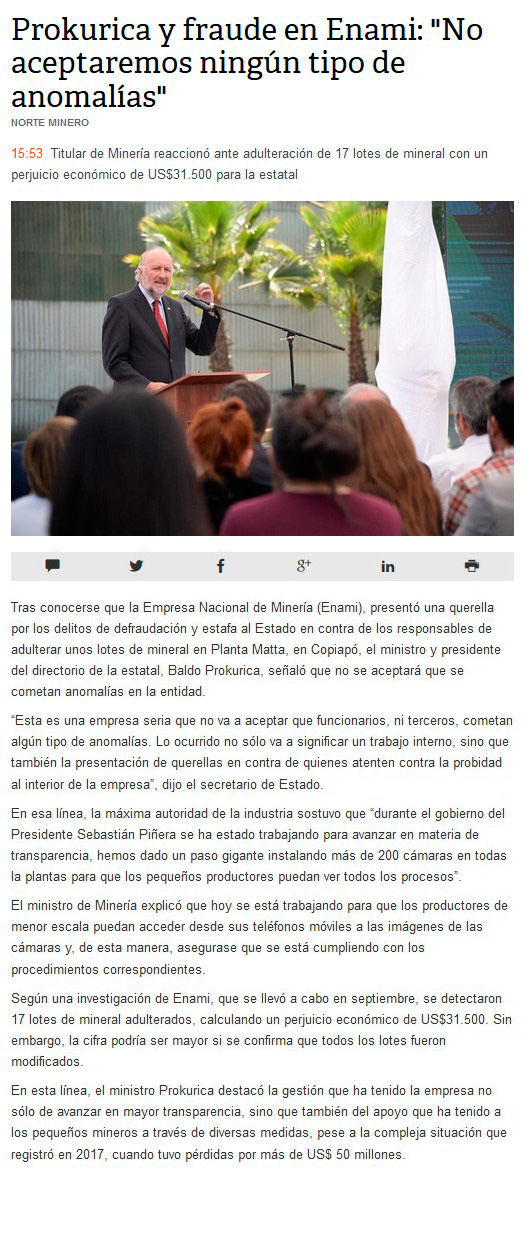 Prokurica por fraude en planta de Enami: “No aceptaremos que funcionarios y terceros cometan anomalías” - (Pulso Online)