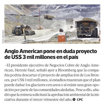 Anglo American dejaría proyecto si crece oposición en Chile - (Diario Financiero)
