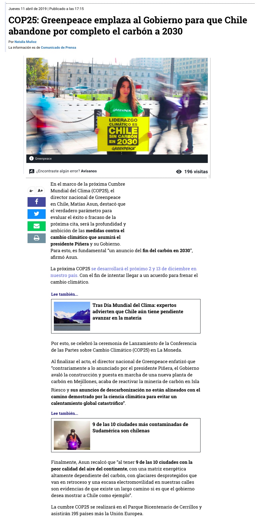 Greenpeace y lanzamiento de COP25: “Para que sea una cumbre climática histórica, Chile debe terminar con el carbón en 2030” - (elciudadano)