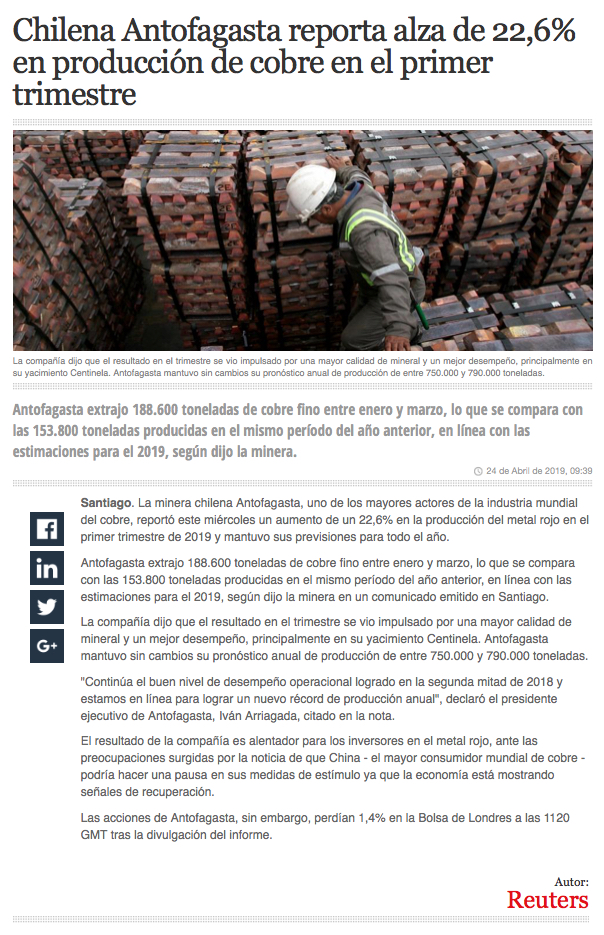 Producción de Antofagasta Minerals creció 22,6% en el primer trimestre - (El Mercurio de Antofagasta)
