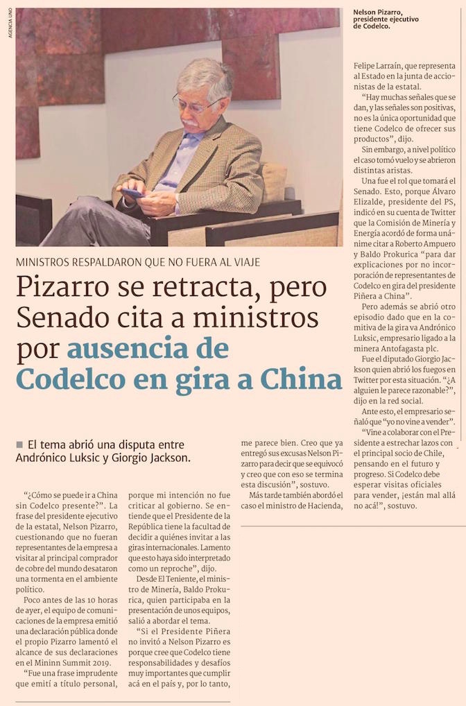 Piñera llama a CEO de Codelco desde China tras impasse y Pizarro asegura que está “todo en paz” - (Pulso)