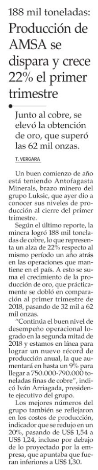 Producción de Antofagasta Minerals creció 22,6% en el primer trimestre - (El Mercurio de Antofagasta)