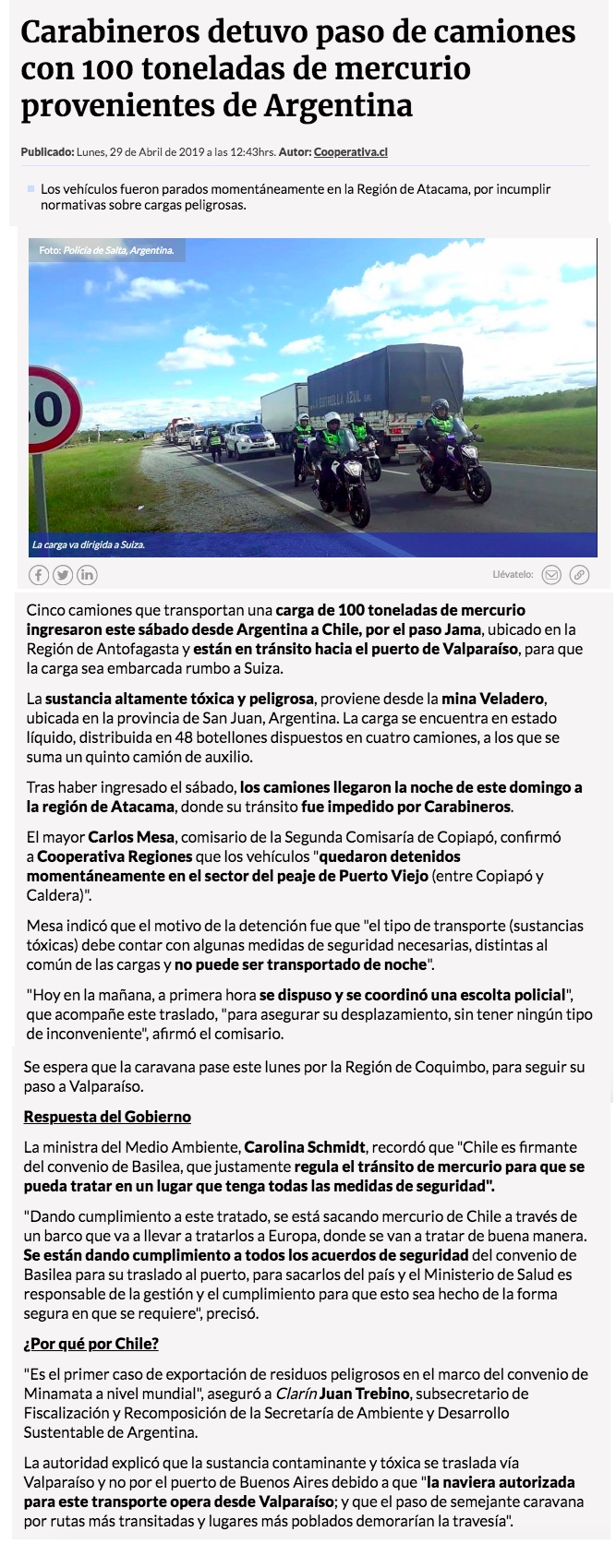 Cinco camiones transportan una carga de 100 toneladas de mercurio por Chile - (Radio Cooperativa)