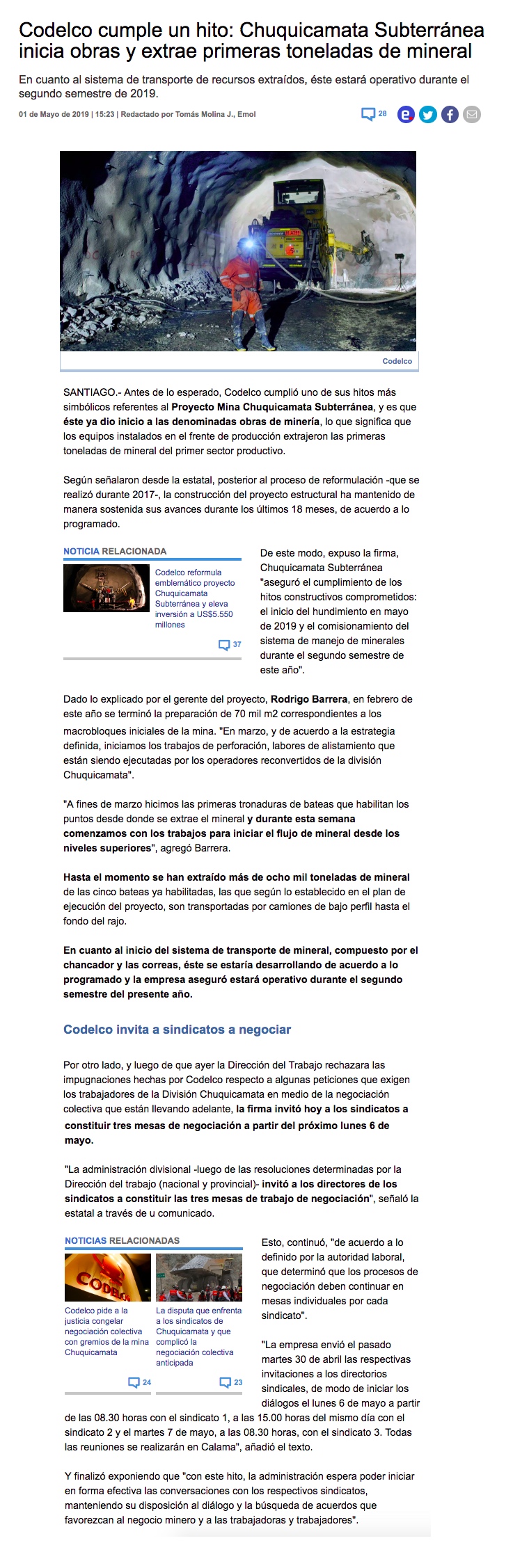 Chuqui comienza a explotarse de manera subterránea tras 104 años - (El Mercurio de Calama)