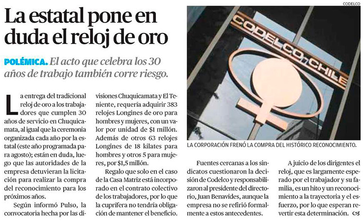 Codelco pone fin a histórica tradición y frena compra de 451 relojes de oro para trabajadores - (Pulso)
