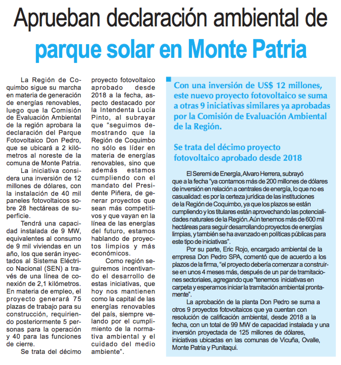 Aprueban inversión de US$ 12 millones en Monte Patria para una nueva planta fotovoltaica - (El Día)