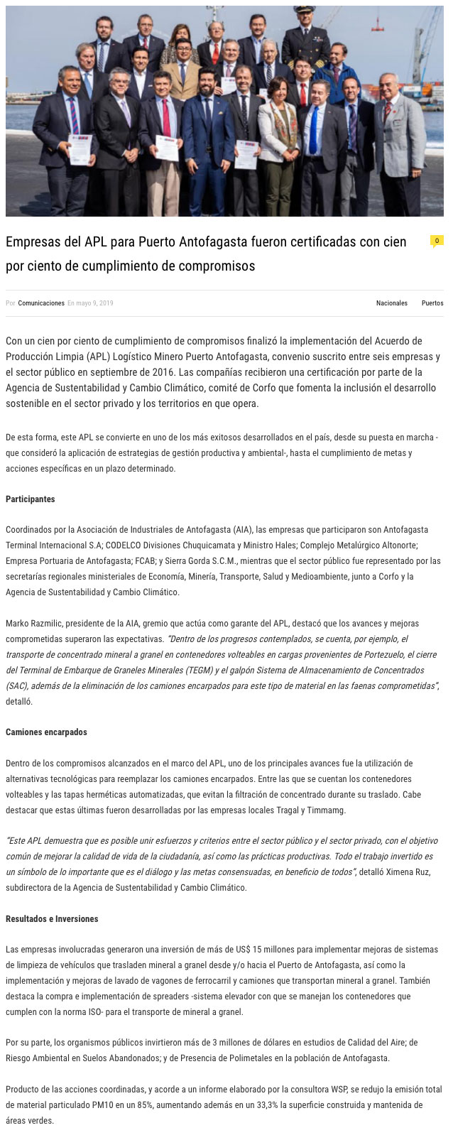 Empresas del Acuerdo de Producción Limpia para Puerto Antofagasta fueron certificadas con cien por ciento de cumplimiento de compromisos - (portalminero)