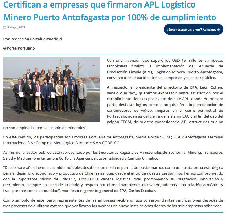 Certifican cumplimiento del 100% en APL logístico minero del puerto - (El Mercurio de Antofagasta)