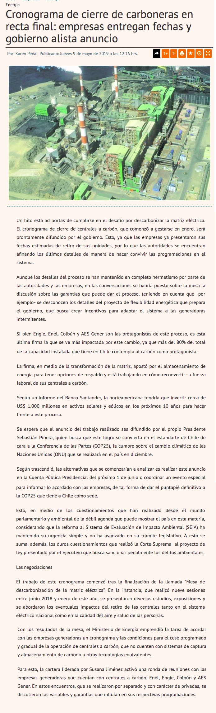 Cronograma de cierre de carboneras en recta final - (Diario Financiero)