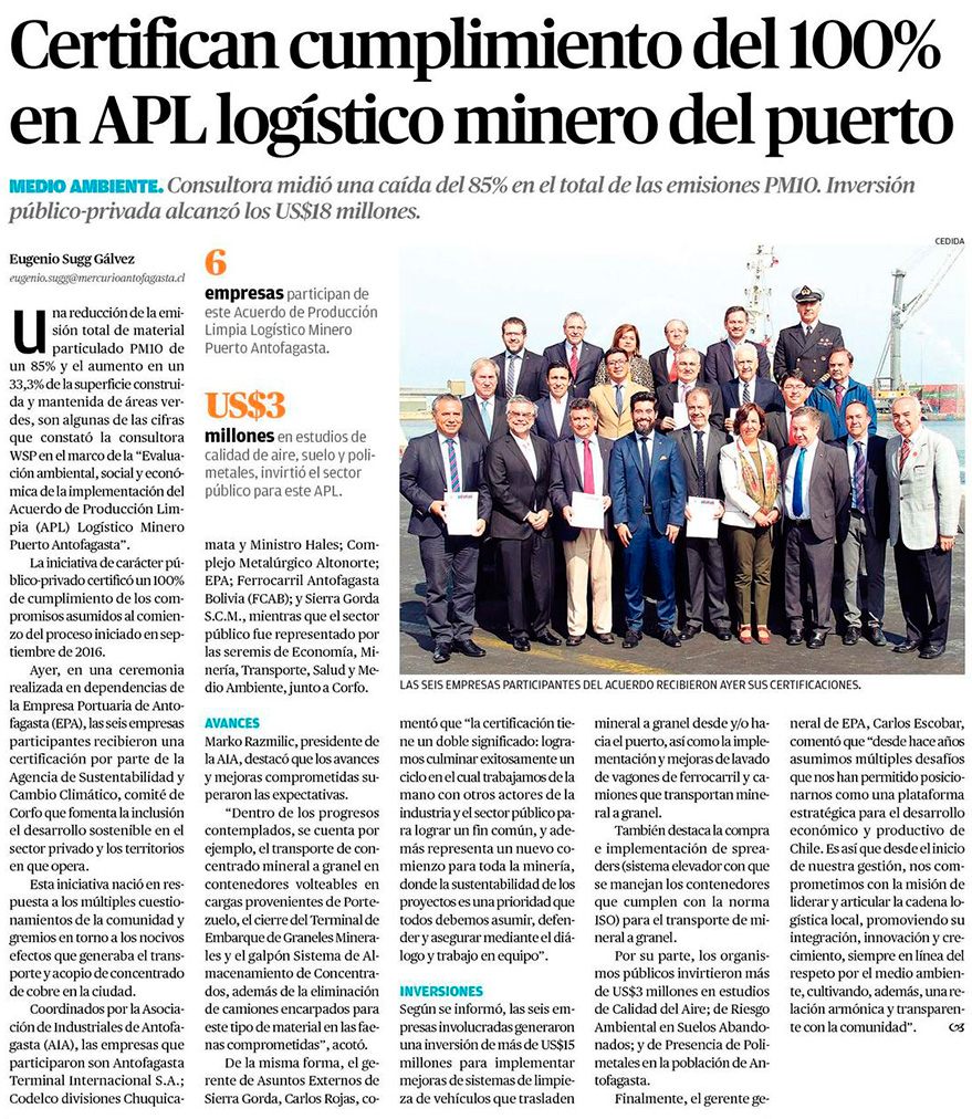 Certifican a empresas que firmaron APL Logístico Minero Puerto Antofagasta por 100% de cumplimiento - (portalportuario)