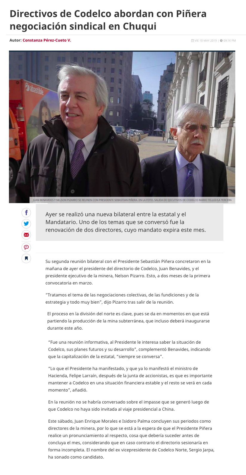Directivos de Codelco abordan con Piñera negociación sindical en Chuqui - (Pulso)